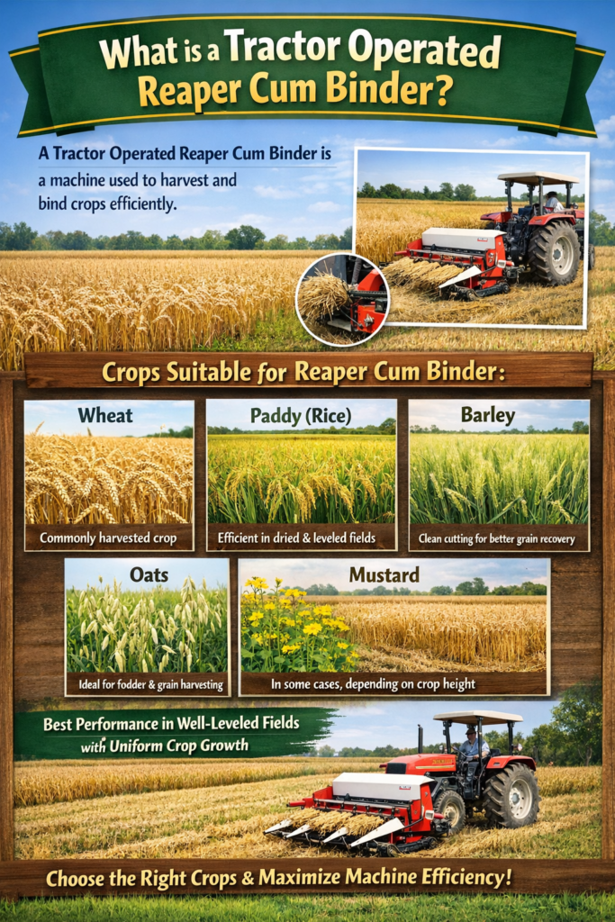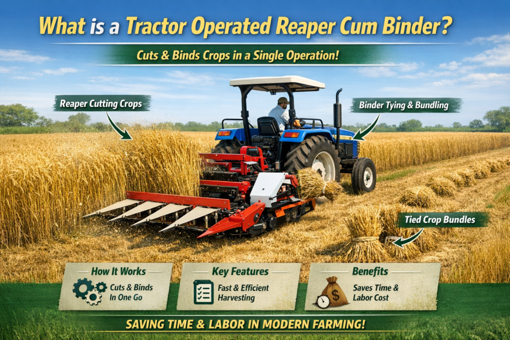 If you are also wondering What is a Tractor Operated Reaper Cum Binder?, it is a powerful agricultural machine attached to a tractor that cuts and binds crops in a single operation. Instead of harvesting manually with sickles and then tying bundles separately, this machine performs both tasks together.